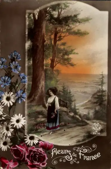 Ak Frau in Elsässer Tracht, Blumen in blau weiß rot