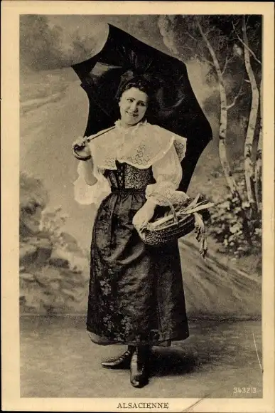 Ak Frau in Elsässer Volkstracht, Porträt, Korb, Sonnenschirm