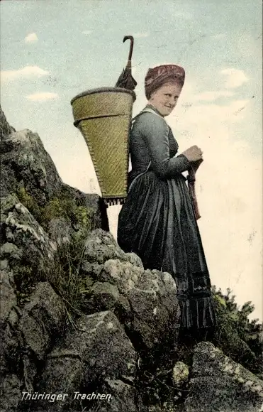 Ak Frau in Thüringer Tracht, Korb, Regenschirm