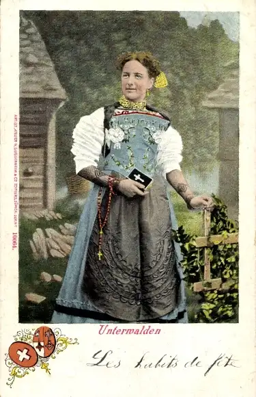 Ak Frau in Tracht aus Unterwalden, Rosenkranz und Bibel