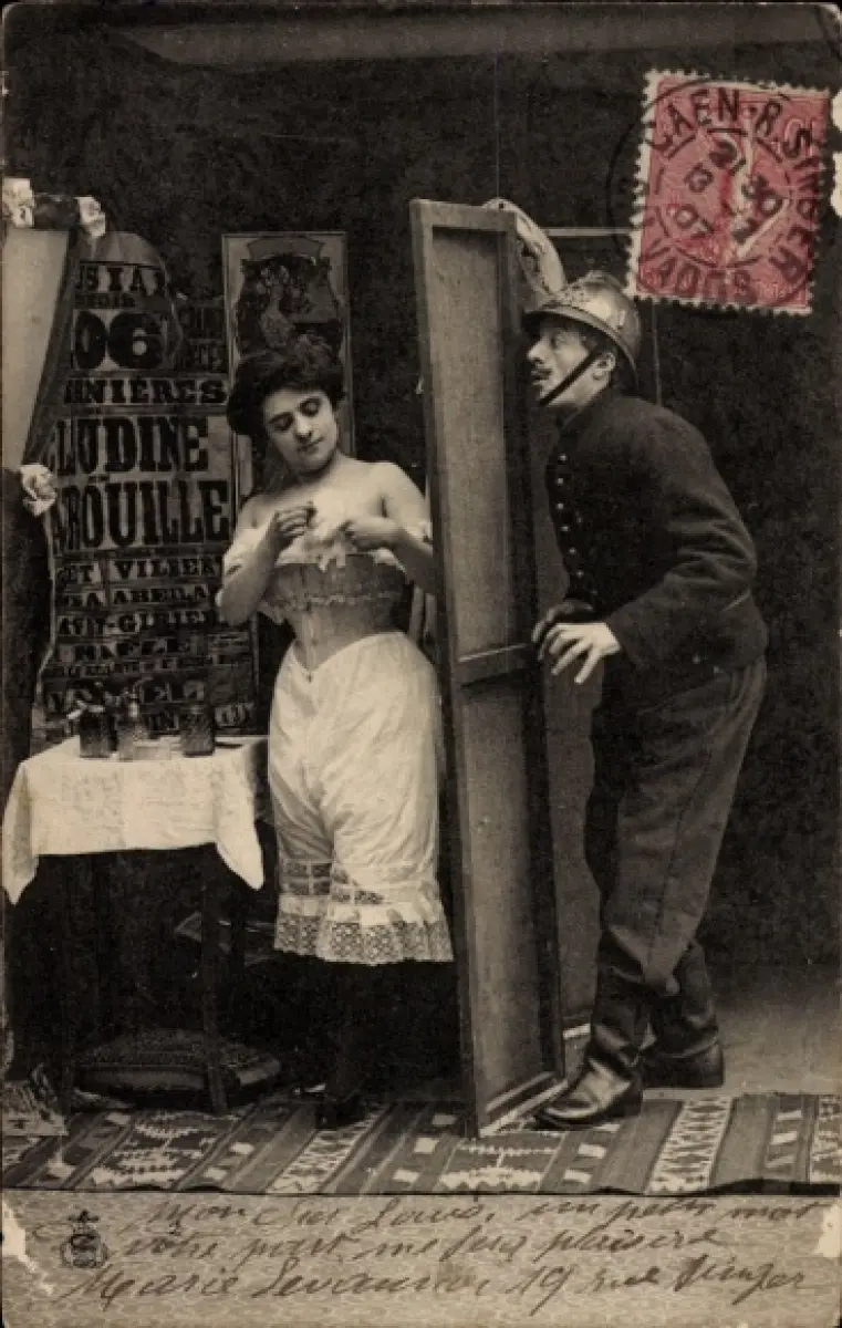 Ak Frau in Unterwäsche, Liebespaar, Mann in Uniform