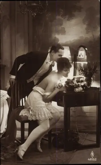 Ak Frau in Unterwäsche, Mann im Frack, Kuss