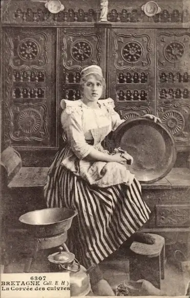 Ak Frau in bretonischer Volkstracht, Hausarbeit, Schrank