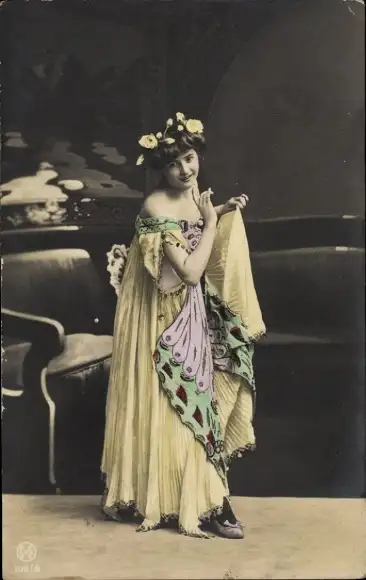 Ak Frau in gelbem Kleid, Blumen, Porträt