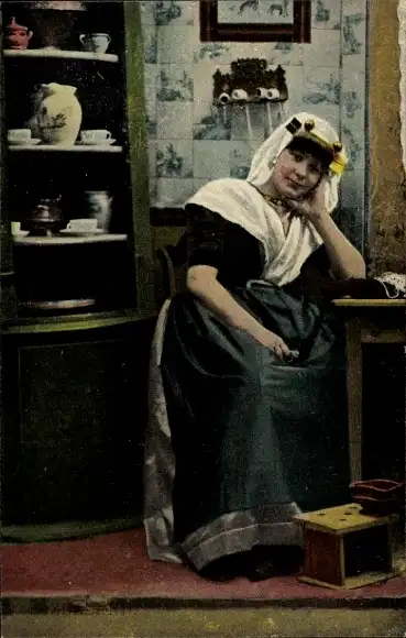 Ak Frau in niederländischer Tracht, Küche, Geschirr
