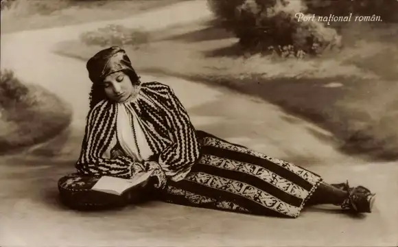 Ak Frau in rumänischer Volkstracht beim Lesen