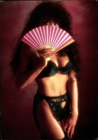 Ak Frau in schwarzer Unterwäsche, Fächer