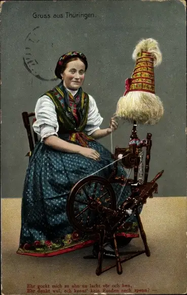 Ak Frau in thüringer Volkstracht am Spinnrad