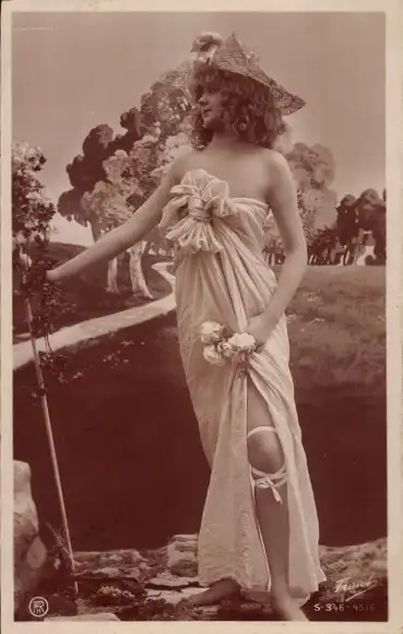 Ak Frau in weißem Kleid, Hut, Blumen, Porträt