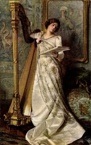 Ak Frau in weißem Kleid, Zeitung, Harfe, Gemälde