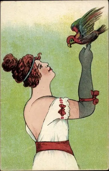 Ak Frau in weißem Kleid mit Papagei