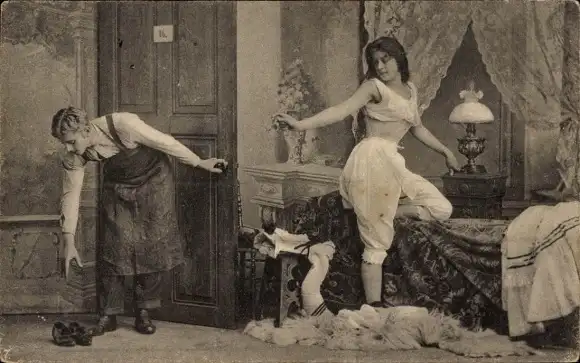 Ak Frau in weißer Unterwäsche, Strümpfe, Bett, Schlafzimmer