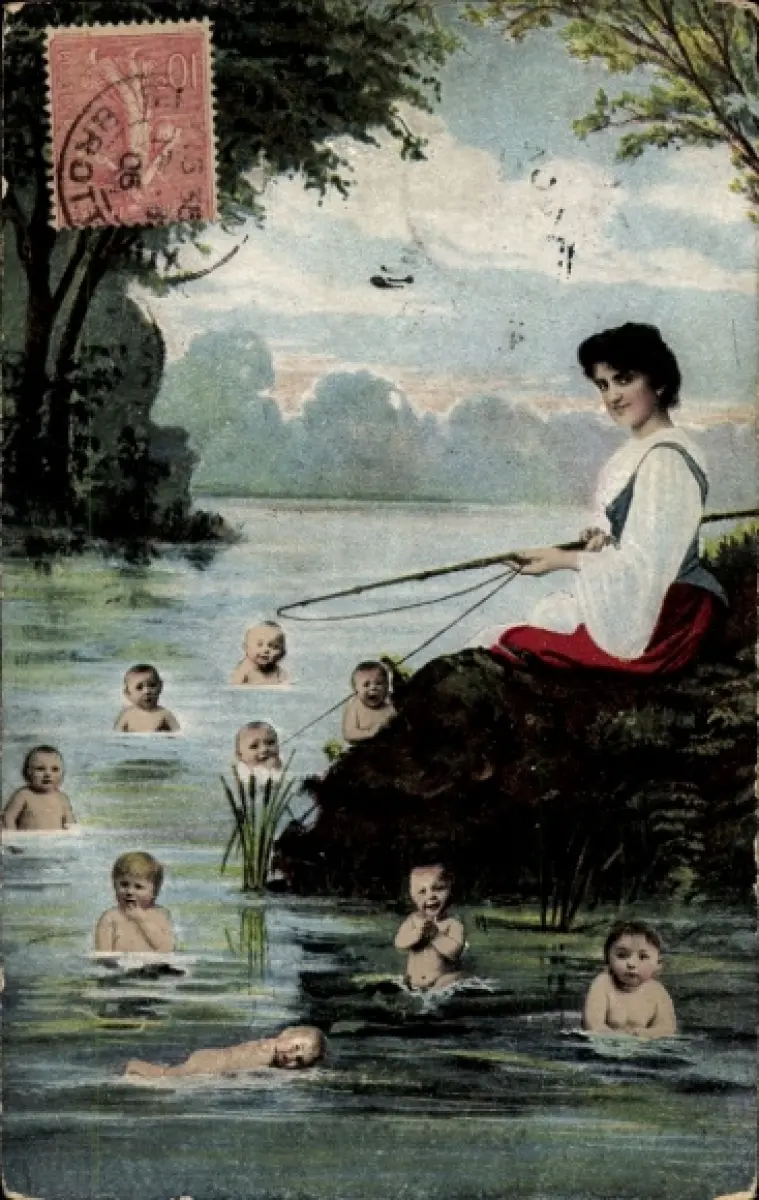 Ak Frau mit Angel am Ufer, Babys und Kleinkinder im Wasser