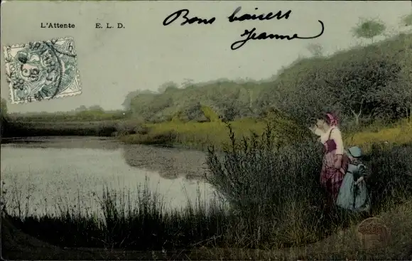 Ak Frau mit Kind am See, Korb, Wiese