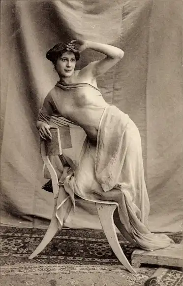 Ak Frau mit durchsichtigem Tuch bedeckt auf einem Stuhl kniend, Busen