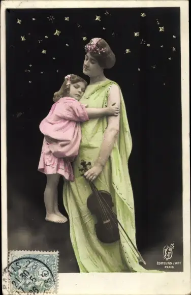 Ak Frau mit ihrer Tochter, Geige, Sterne