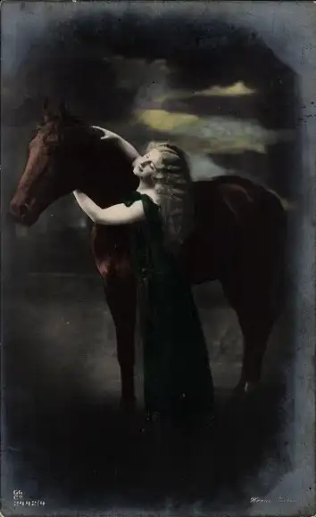 Ak Frau mit langem Haar, Pferd