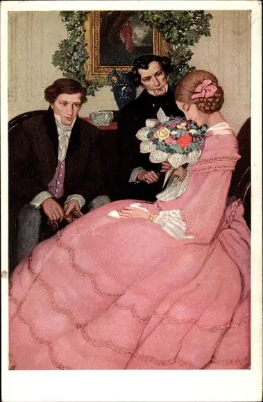 Ak Frau mit zwei Verehrern, Geschenk, Blumenstrauß, Liebe