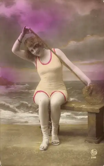 Ak Frau posiert in gelbem Badeanzug am Strand