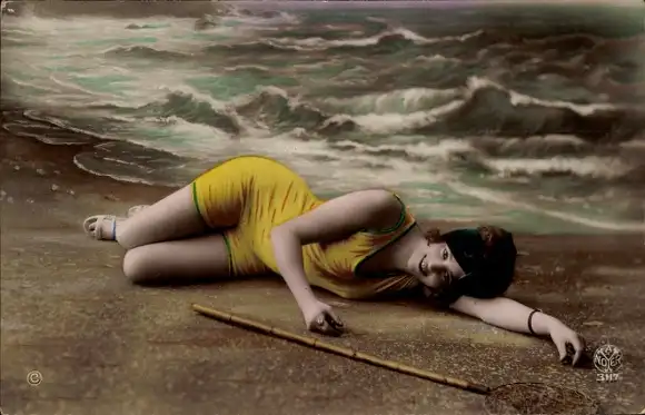 Ak Frau posiert liegend in gelbem Badeanzug am Strand
