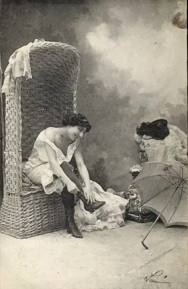 Ak Frau zieht sich um, Strand, Sonnenschirm, Strandkorb