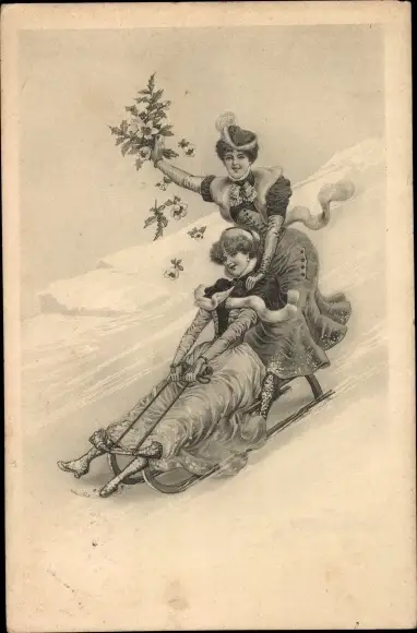 Ak Frauen auf einem Schlitten bei der Abfahrt