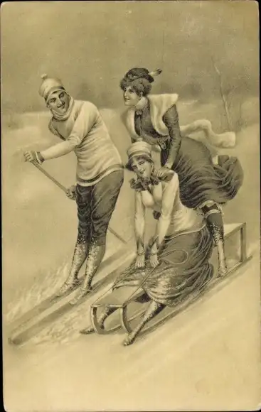 Ak Frauen fahren Schlitten, Mann fährt Ski, Wintersport