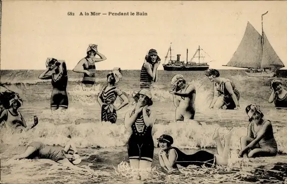 Ak Frauen im Wasser, Bademode, Badeanzug, Segelboot