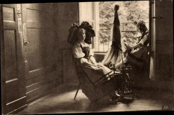 Ak Frauen in Elsässer Tracht, Spinnrad