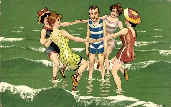 Ak Frauen tanzen um einen Mann herum, Bademode, Badeanzug
