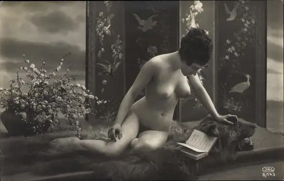 Ak Frauenakt, nackte Frau auf einem Bärenfell, Busen