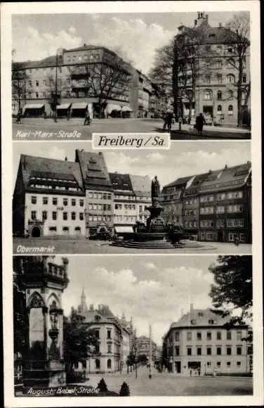 Ak Freiberg in Sachsen, Karl-Marx-Straße, Obermarkt, August-Bebel-Straße