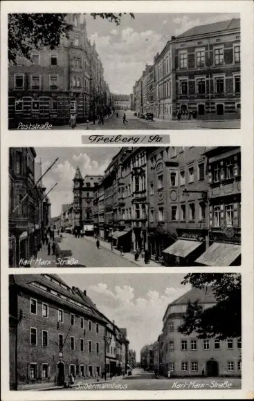 Ak Freiberg in Sachsen, Poststraße, Karl-Marx-Straße, Silbermannhaus