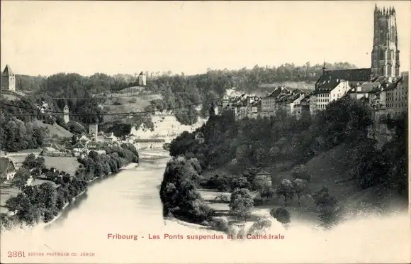 Ak Freiburg Stadt Freiburg Schweiz, Hängebrücken, Kathedrale