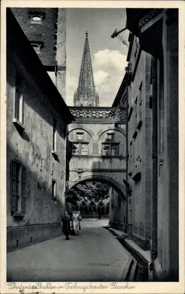 Ak Freiburg im Breisgau, Scheidende Strahlen in Freiburgs trauten Gässchen