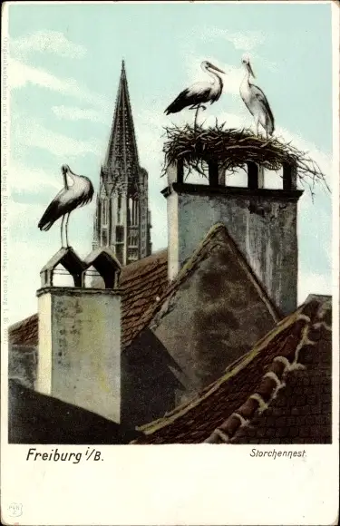 Ak Freiburg im Breisgau, Storchennest, Kirchturm