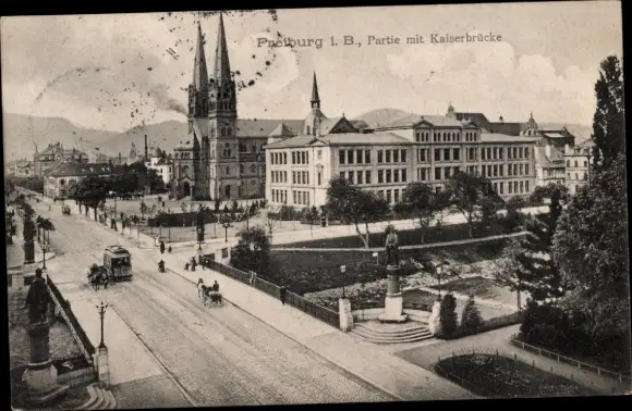 Ak Freiburg im Breisgau, Teilansicht, Kaiserbrücke, Straßenbahn, Denkmal
