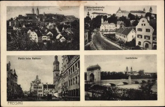 Ak Freising in Oberbayern, Münchnerstraße, Domberg, Rathaus, Isarbrücke, Gesamtansicht