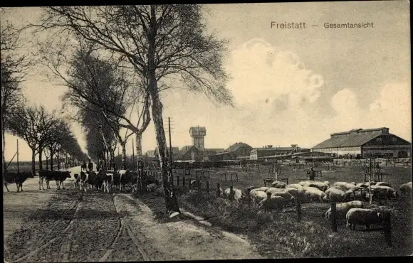 Ak Freistatt in Niedersachsen, Gesamtansicht, Schweine, Rinder