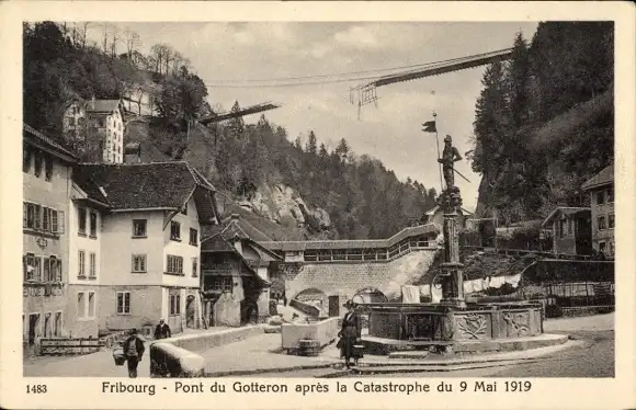 Ak Fribourg Freiburg Stadt Schweiz, Gotteron-Brücke nach dem Einsturz, 9. Mai 1919
