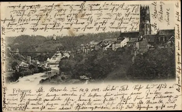 Ak Fribourg Freiburg Stadt Schweiz, Teilansicht, Fluss, Kirche