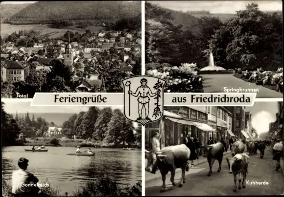 Ak Friedrichroda im Thüringer Wald, Ortsansicht, Springbrunnen, Gondelteich, Kuhherde