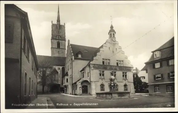 Ak Friedrichshafen am Bodensee, Rathaus, Zeppelinbrunnen