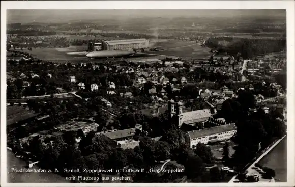 Ak Friedrichshafen am Bodensee, Schloss, Zeppelinwerft, Luftschiff Garf Zeppelin, Fliegeraufnahme
