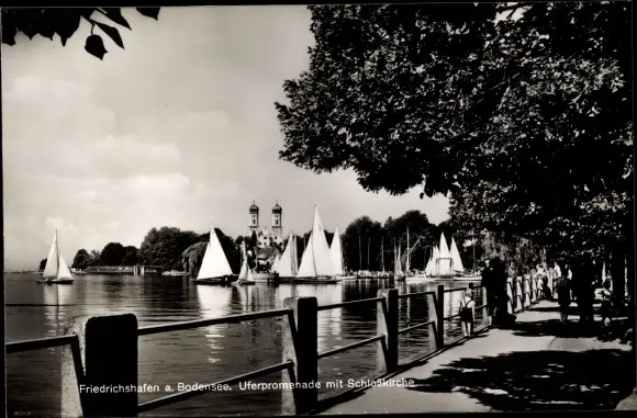 Ak Friedrichshafen am Bodensee, Uferpromenade mit Schlosskirche, Segelboote