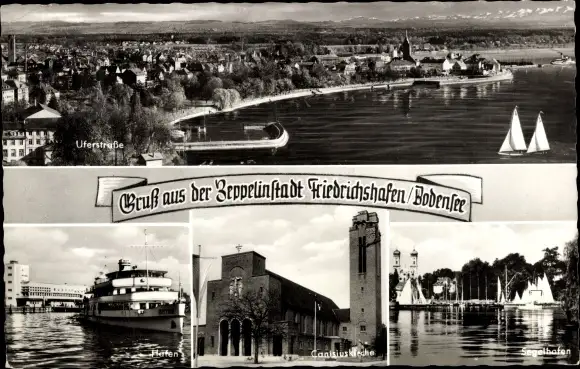 Ak Friedrichshafen am Bodensee, Zeppelinstadt, Uferstraße, Hafen, Canisiuskirche, Segelhafen