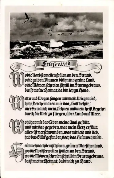 Ak Friesenlied, Wo die Nordseewellen spülen an den Strand, Möwen