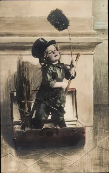 Ak Fröhliches Neujahr, Kind als Schornsteinfeger, Koffer