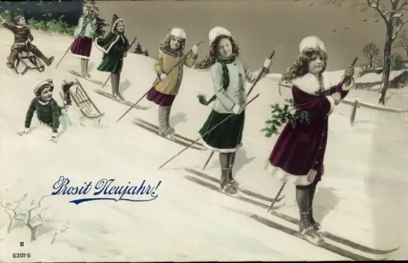 Ak Fröhliches Neujahr, Kinder auf Skiern, Schlitten