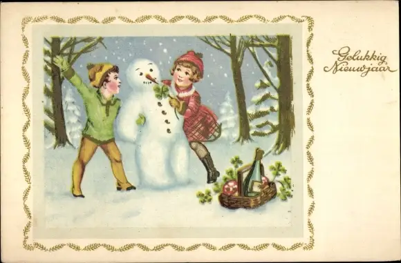 Ak Fröhliches Neujahr, Schneemann, Kinder, Korb mit Sekt und Kleeblättern